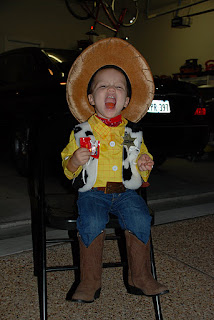 This year he was Woody from the movie "Toy Story". I started working on his costume well in advance so it was all put together in plenty of time. My mom always made our costumes when we were growing up and I really wish I could make his costumes special like that, although I'm not quite there yet in my sewing skills. :) So, thank goodness for Etsy and Amazon!